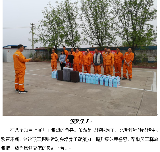 2019職工趣味運動會 為進一步增強職工們的身體素質,豐富文體生活,增強凝聚力,在“五四”青年節來臨之際兗州文水分公司、呂梁分公司、中材文水分公司精心籌備,周密策劃的職工趣味運動會,在兗州文水分公司生活區如期舉行。本次運動會的主題是“以促進友誼為主,貴在人人參與,活躍公司氣氛”。以青年員工為主20多名干部職工參加了本次運動會。通過自娛自樂這種形式,增強團隊合作精神,培養職工熱愛運動,促進身體健康,增強公司凝聚力、戰斗力、號召力的目的。5月6日下午,三個分公司的職工趣味運動會,在經理王建立宣讀比賽規則后拉開了帷幕。此次活動由辦公室人員組織策劃,得到公司大力支持與全體員工的積極配合和參與。本次運動會共設有八個比賽項目: